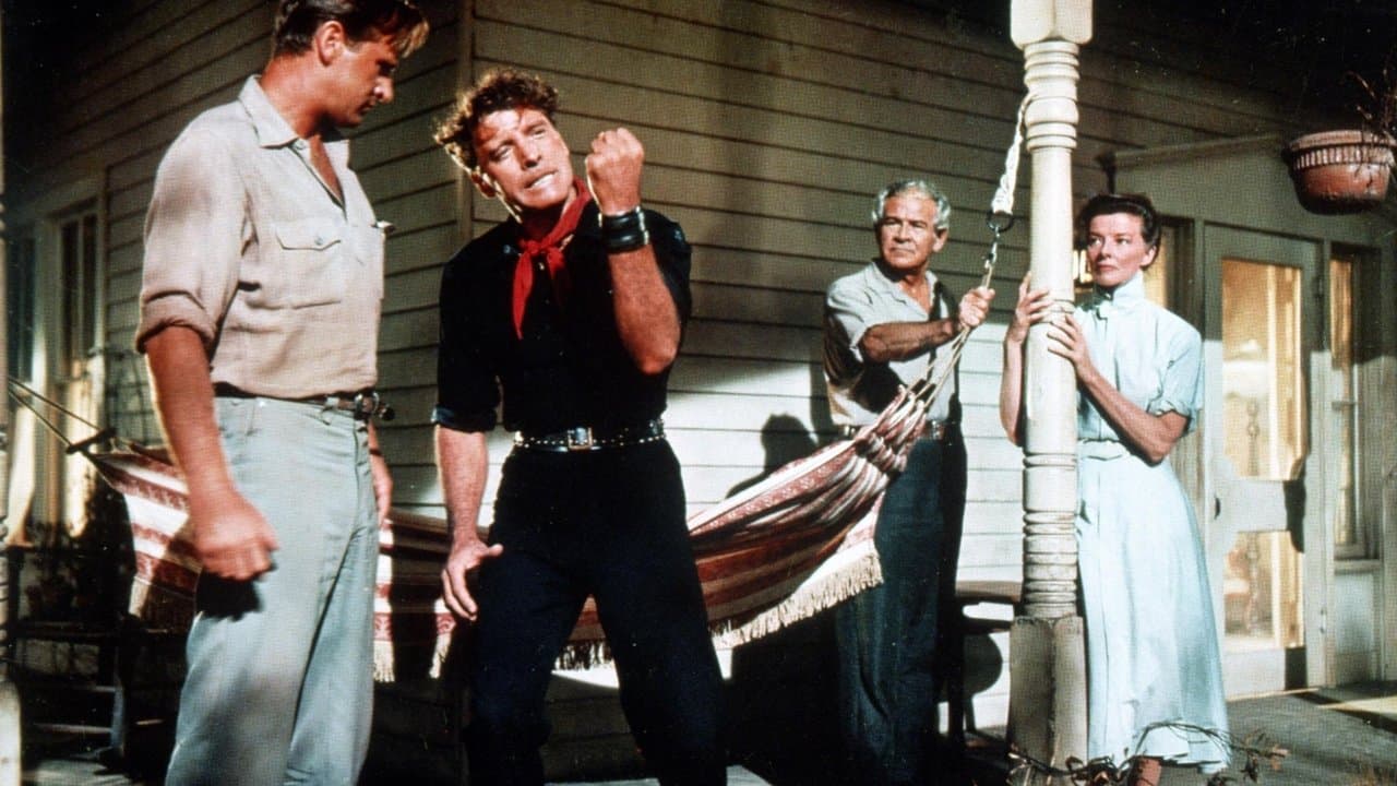 The Rainmaker is a romance, western film released in 1956 exploring themes of con man, unrequited love, stranger, drought, spinster, pray for rain. Directed by Joseph Anthony, it stars Burt Lancaster, Katharine Hepburn, Wendell Corey. Lizzie Curry is on the verge of becoming a hopeless old maid. Her wit and intelligence and skills as a homemaker can't make up for the fact that she's just plain plain! Even the town sheriff, File, for whom she harbors a secrect yen, won't take a chance --- until the town suffers a drought and into the lives of Lizzie and her brothers and father comes one Bill Starbuck ... profession: Rainmaker!